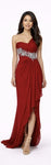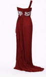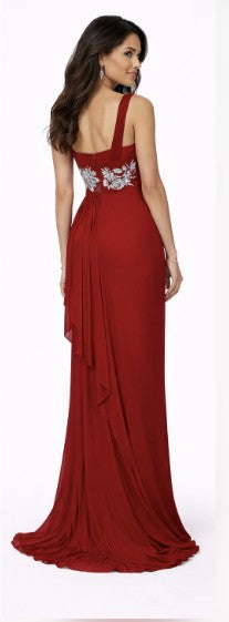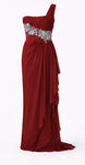 • One shoulder draped chiffon gown with beaded details at front and back and