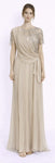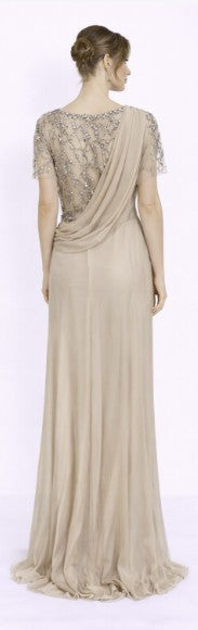 • Short sleeve beaded chiffon gown with front and back bodice drape