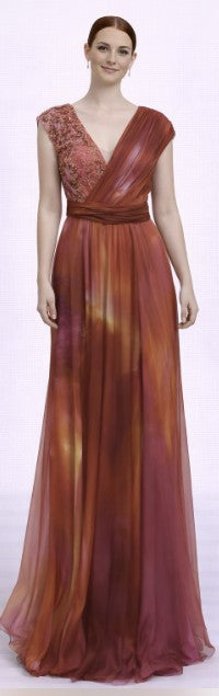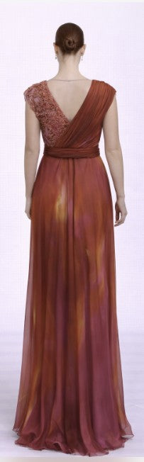 • Wrap vneck degrade gown with pleats and center front embroidery