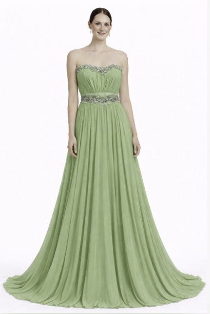 • Strapless chiffon gown with embroidery on the neckline and waist, pleated on bodice and skirt