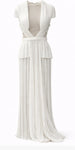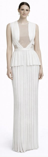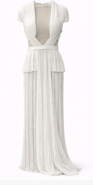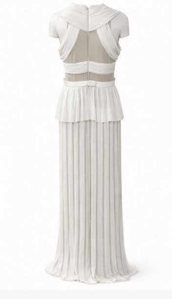 • White pleated sleeveless gown with illusion bodice