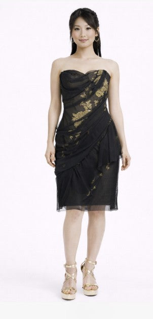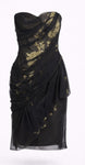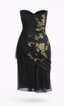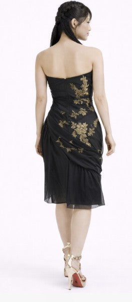 • Strapless black and gold embroidery organza pleated cocktail dress