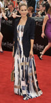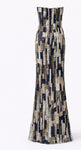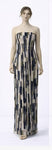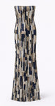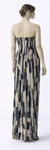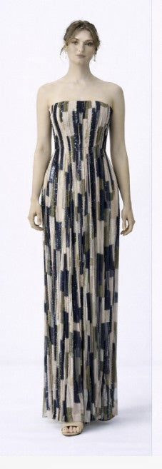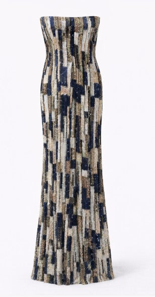 • Strapless column gown with multicolored fabric strips and sequence throughout