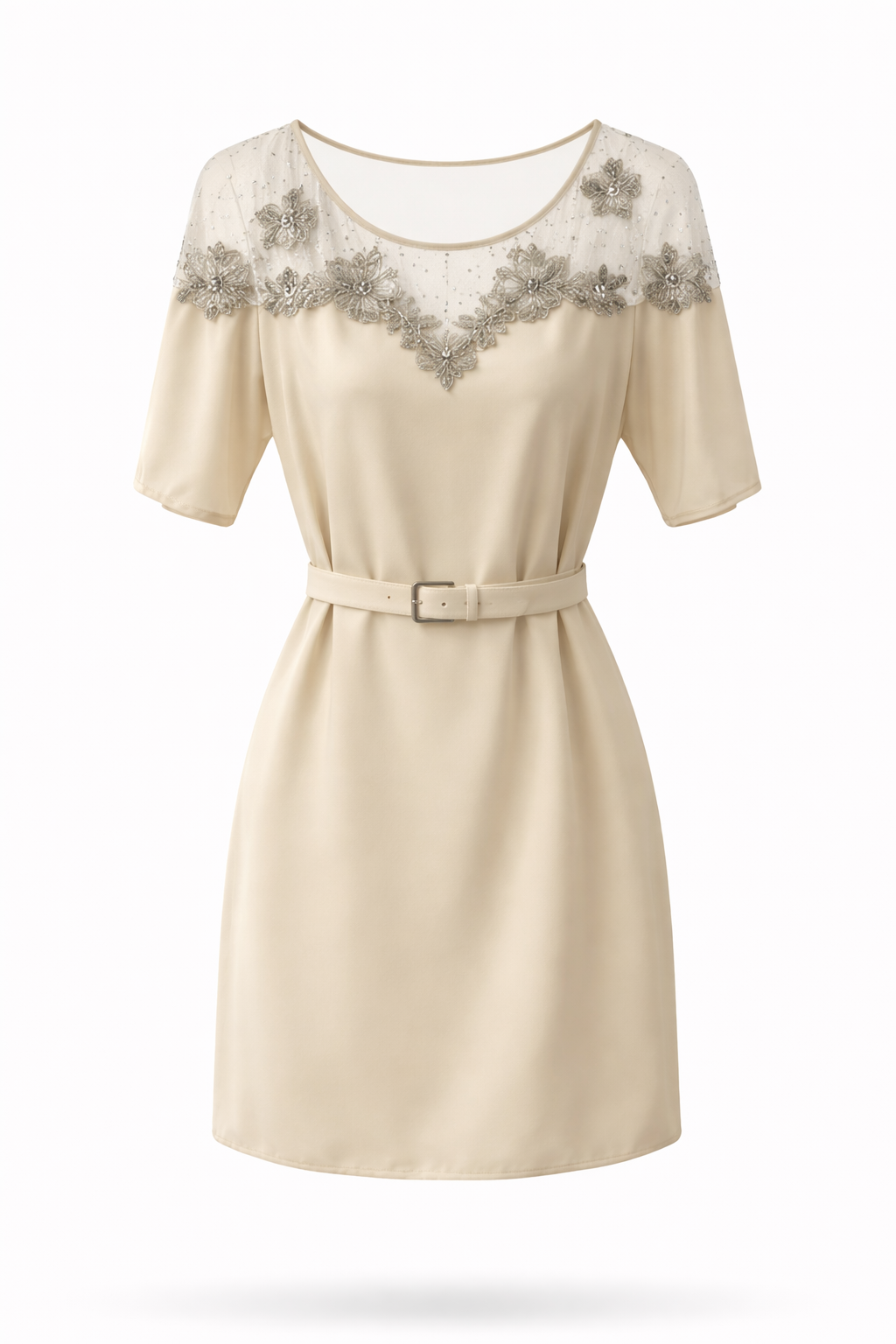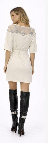 • Short sleeve dress with illusion-lace neckline and self belt
