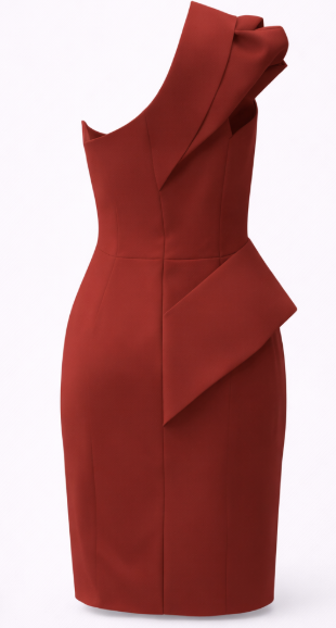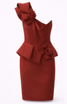 • One shoulder cocktail dress with fabric flower details at shoulder and waist