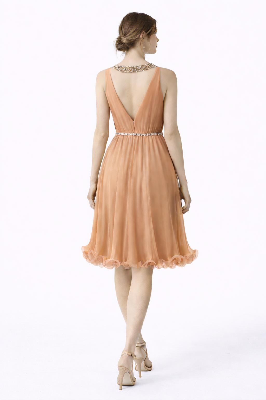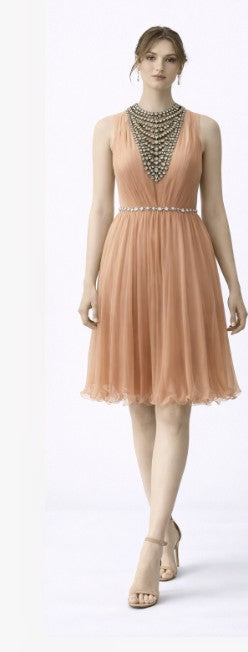 • Sleeveless pleated cocktail dress with beaded neckline