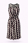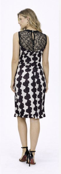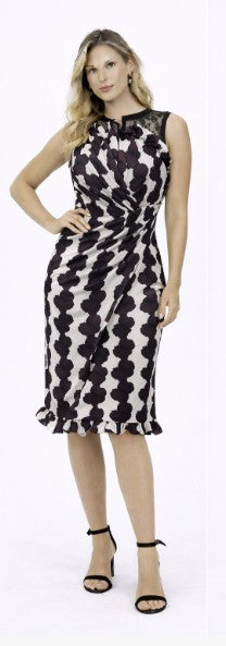 • Sleeveless printed drape front dress, lace neck accent, pleat at hem