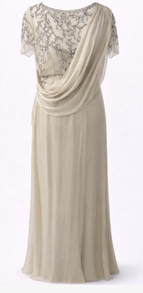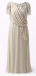 • Short sleeve beaded chiffon gown with front and back bodice drape